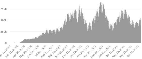 SITUATION MONDIALE : Situation épidémiologique : Vendredi 12 novembre 2021 le nombre de personnes contaminées dans le monde par le coronavirus Covid-19 depuis le début de la pandémie (Source officielle), s’élève à 252,746,293 cas (+546,268 en 24h), la veille (+516,953) Nombre de pays contaminés : 221 *Guérisons : 228,666,060 personnes ont été guéries du Covid-19 dans le monde (+406,610 en 24h), la veille (+393,427) *Décès : 5,098,211 personnes sont mortes du Covid-19 dans le monde (+8,530 en 24h), la veille (+7,203) *Cas actifs (moins décès et guérisons) dans le monde est actuellement de 18,982,022 cas (+131,128 en 24h), la veille (+116,323) Taux moyen de guérison au monde : 90,47% (-) Taux moyen de mortalité au monde : 2,01% (=) Monde : Nombre de cas confirmés quotidiens :