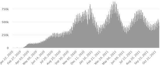 SITUATION MONDIALE : Situation épidémiologique : Mercredi 17 novembre 2021 le nombre de personnes contaminées dans le monde par le coronavirus Covid-19 depuis le début de la pandémie (Source officielle), s’élève à 255,212,937 cas (+581,954 en 24h), la veille (+570,042) Nombre de pays contaminés : 221 *Guérisons : 230,722,695 personnes ont été guéries du Covid-19 dans le monde (+493,947 en 24h), la veille (+487,451) *Décès : 5,132,615 personnes sont mortes du Covid-19 dans le monde (+9,347 en 24h), la veille (+7,128) *Cas actifs (moins décès et guérisons) dans le monde est actuellement de 19,357,627 cas (+78,660 en 24h), la veille (+75,463) Taux moyen de guérison au monde : 90,40% (-) Taux moyen de mortalité au monde : 2,01% (=) Monde : Nombre de cas confirmés quotidiens :