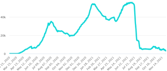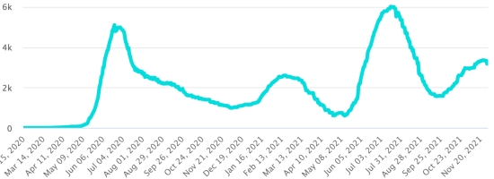 Vaccination : 8,02 millards de doses de vaccin injectées (+40 millions de doses injectées en 24h. Mise à jour 30 novembre 2021 (dernières données disponibles). HAÏTI : Situation épidémiologique : Selon le Ministère de la Santé Publique, +90 nouveaux cas en 48h de Covid-19 et de ses variants auraient été confirmés en Haïti les 25 et 26 novembre 2021 (dernières données partielles disponibles) pour un total de 25,265 cas confirmés sur l’ensemble du territoire national (47.4% de femmes et 52.6% hommes), depuis le premier cas (19 mars 2020 https://www.haitilibre.com/article-30319-haiti-sante-origine-des-2-premiers-cas-de-covid-19-en-haiti.html ). Précédente mise à jour (+148 cas les 23 et 24 novembre 2021). Guérisons : 21,357 (+95 en 48h) Taux de guérison : 84,53% (+) Décès : 738 décès +0 en 48h () Taux de mortalité : 2,92% (-) Haïti : Tendance des décès :