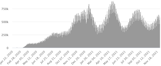 SITUATION MONDIALE : Situation épidémiologique : Mercredi 1er décembre 2021 le nombre de personnes contaminées dans le monde par le coronavirus Covid-19 depuis le début de la pandémie (Source officielle), s’élève à 263,096,771 cas (+592,217 en 24h), la veille (+694,566) Nombre de pays contaminés : 221 *Guérisons : 237,629,306 personnes ont été guéries du Covid-19 dans le monde (+554,535 en 24h), la veille (+606,390) *Décès : 5,234,297 personnes sont mortes du Covid-19 dans le monde (+7,171 en 24h), la veille (+8,752) *Cas actifs (moins décès et guérisons) dans le monde est actuellement de 20,233,168 cas (+30,464 en 24h), la veille (+79,424) Taux moyen de guérison au monde : 90,32% (+) Taux moyen de mortalité au monde : 1,98% (-) Monde : Nombre de cas confirmés quotidiens :