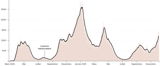 Test : 13,752,569 personnes testées depuis le premier cas (97,663 en 72h) Vaccination : 13,776,224 millions de doses de vaccin injectées depuis le 16 décembre 2020 date de la première injection (+81,127 en 72h), dernières données disponibles - MSSS en date du 6 décembre 2021) FRANCE : *Cas confirmés depuis le premier cas (24 janvier 2020) : 7,928,572 cas (+11,308 cas en 24h), la veille (+ 42,252) *Guérisons : 7,211,423 guérisons (+40,043 en 24h), la veille (+3,241) Taux national de Guérison : 90,95% (-) Décès : 119,535 décès (non disponible), la veille (+29) Taux national de mortalité : 1,50% (=) *Cas actifs : (excluant décès et guérisons) 597,614 (-28,735 en 24h), la veille (+38,982) France : Tendance cas actifs : (moins guérisons et décès)
