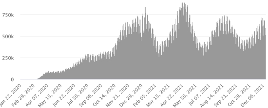 SITUATION MONDIALE : Situation épidémiologique : Mardi 14 décembre 2021 le nombre de personnes contaminées dans le monde par le coronavirus Covid-19 et ses variants depuis le début de la pandémie s’élève à 271,161,459 cas (+703,430 en 24h), la veille (+505,304) Nombre de pays contaminés : 221 *Guérisons : 243,850,350 personnes ont été guéries du Covid-19 dans le monde (+644,214 en 24h), la veille (+408,116) *Décès : 5,330,605 personnes sont mortes du Covid-19 dans le monde (+7,627 en 24h), la veille (+4,467) *Cas actifs (moins décès et guérisons) dans le monde est actuellement de 21,980,504 cas (+51,589 en 24h), la veille (+33,837) Taux moyen de guérison au monde : 89,92% (=) Taux moyen de mortalité au monde : 1,96% (=) Monde : Nombre de cas confirmés quotidiens :