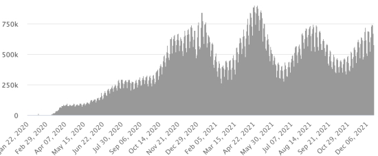 SITUATION MONDIALE : Situation épidémiologique : Mardi 21 décembre 2021 le nombre de personnes contaminées dans le monde par le coronavirus Covid-19 et ses variants depuis le début de la pandémie s’élève à 275,839,211 cas (+775,286 en 24h), la veille (+480,373) Nombre de pays contaminés : 221 *Guérisons : 247,547,448 personnes ont été guéries du Covid-19 dans le monde (+697,911 en 24h), la veille (+439,986) *Décès : 5,377,934 personnes sont mortes du Covid-19 dans le monde (+5,746 en 24h), la veille (+3,990) *Cas actifs (moins décès et guérisons) dans le monde est actuellement de 22,913,829 cas (+71,629 en 24h), la veille (+36,397) Taux moyen de guérison au monde : 89,74% (=) Taux moyen de mortalité au monde : 1,94% (-) Monde : Nombre de cas confirmés quotidiens :