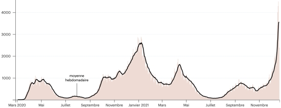 Test : 14,353,426, personnes testées depuis le premier cas (+43,912 en 24h) Vaccination : 14,435,353 millions de doses de vaccin injectées depuis le 14 décembre 2020 date de la première injection (+73,188 en 24h), dernières données disponibles - MSSS en date du 20 décembre 2021) FRANCE : *Cas confirmés depuis le premier cas (24 janvier 2020) : 8,713,756 cas (+72,832 cas en 24h), la veille (+15,075) *Guérisons : 7,603,397 guérisons (+49,610), la veille (+46,878) Taux national de Guérison : 87,25% (-) Décès : 121,927 décès (+229 en 24h), la veille (+224) Taux national de mortalité : 1,39% (-) *Cas actifs : (excluant décès et guérisons) 988,413 (+22,993 en 24h), la veille (-32,027) France : Tendance cas actifs : (moins guérisons et décès)