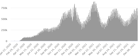 SITUATION MONDIALE : Situation épidémiologique : Mercredi 22 décembre 2021 le nombre de personnes contaminées dans le monde par le coronavirus Covid-19 et ses variants depuis le début de la pandémie s’élève à 276,619,846 cas (+780,635 en 24h), la veille (+775,286) Nombre de pays contaminés : 221 *Guérisons : 248,150,493 personnes ont été guéries du Covid-19 dans le monde (+603,045 en 24h), la veille (+697,911) *Décès : 5,386,096 personnes sont mortes du Covid-19 dans le monde (+8,162 en 24h), la veille (+5,746) *Cas actifs (moins décès et guérisons) dans le monde est actuellement de 23,083,257 cas (+169,428 en 24h), la veille (+71,629) Taux moyen de guérison au monde : 89,70% (-) Taux moyen de mortalité au monde : 1,94% (=) Monde : Nombre de cas confirmés quotidiens :