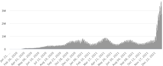 SITUATION MONDIALE 2019-2022 : Situation épidémiologique : Mardi 25 janvier 2022 le nombre de personnes contaminées dans le monde par le coronavirus Covid-19 et ses variants depuis le début de la pandémie (11 mars 2020) s’élève à 355,819,709 cas (+3,584,899 en 24h), la veille (+2,224,084) Nombre de pays contaminés : 221 *Guérisons : 282,381,970 personnes ont été guéries du Covid-19 dans le monde (+2,449,474 en 24h), la veille (+1,394,446) *Décès : 5,623,631 personnes sont mortes du Covid-19 dans le monde (+8,549 en 24h), la veille (+4,682) *Cas actifs (moins décès et guérisons) dans le monde est actuellement de 67,814,108 cas (+1,126,876 en 24h), la veille (+824,956) Taux moyen de guérison au monde : 79,36% (-) Taux moyen de mortalité au monde : 1,58% (-) Monde : Nombre de cas confirmés quotidiens :