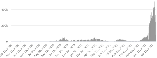SITUATION MONDIALE 2019-2022 : Situation épidémiologique : Jeudi 3 février 2022 le nombre de personnes contaminées dans le monde par le coronavirus Covid-19 et ses variants depuis le début de la pandémie (11 mars 2020) s’élève à 385,692,034 cas (+3,198,106 en 24h), la veille (+3,451,109) Nombre de pays contaminés : 221 *Guérisons : 305,647,111 personnes ont été guéries du Covid-19 dans le monde (+2,382,931 en 24h), la veille (+4,072,272) *Décès : 5,720,212 personnes sont mortes du Covid-19 dans le monde (+12,688 en 24h), la veille (+15,109) *Cas actifs (moins décès et guérisons) dans le monde est actuellement de 74,324,711 cas (+802,487 en 24h), la veille (-606,272) Taux moyen de guérison au monde : 79,24% (-) Taux moyen de mortalité au monde : 1,48% (-) Monde : Nombre de cas confirmés quotidiens :