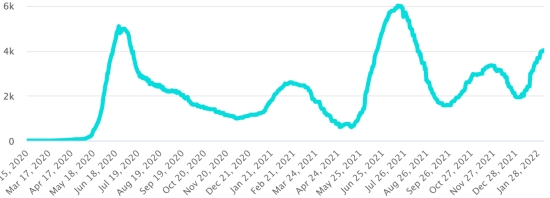 (Jour-1) Vaccination : 542,68 millions de doses de vaccin injectées depuis le 14 décembre 2020 date de la première injection aux États-Unis (+680,000 doses en 24h). Mise à jour 5 février 2022 (dernières données disponibles). RÉPUBLIQUE DOMINICAINE : Cas confirmés depuis le 1er mars 2020 : 561,657 cas (+1,620 en 24h) la veille (+1,101). Premier cas (1er mars 2020) Guérisons : 552,489 guérisons (+2,516 en 24h), la veille (+754) Taux national de Guérison : 98,36% (+) Décès : 4,322 décès (+3 en 24h), la veille (+4) Taux de mortalité : 0,76% (-) Taux de positivité sur 4 semaines épidémiologiques : 23.4% (-) Cas actifs : (excluant décès et guérisons) 4,846 cas (-899 en 24h) la veille (+343) République Dominicaine : Tendance cas actifs : (moins guérisons et décès)