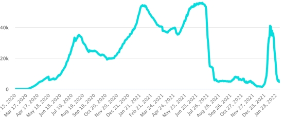 (Jour-1) Vaccination : 543,62 millions de doses de vaccin injectées depuis le 14 décembre 2020 date de la première injection aux États-Unis (+400,000 doses en 24h). Mise à jour 7 février 2022 (dernières données disponibles). RÉPUBLIQUE DOMINICAINE : Cas confirmés depuis le 1er mars 2020 : 563,657 cas (+1,044 en 24h) la veille (+956). Premier cas (1er mars 2020) Guérisons : 554,590 guérisons (+774 en 24h), la veille (+1,327) Taux national de Guérison : 98,39% (-) Décès : 4,329 décès (+4 en 24h), la veille (+3) Taux de mortalité : 0,76% (=) Taux de positivité sur 4 semaines épidémiologiques : 20,9% (-) Cas actifs : (excluant décès et guérisons) 4,738 cas (+266 en 24h) la veille (-374) République Dominicaine : Tendance cas actifs : (moins guérisons et décès)