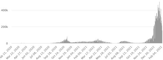 SITUATION MONDIALE 2019-2022 : Situation épidémiologique : Lundi 7 février 2022 le nombre de personnes contaminées dans le monde par le coronavirus Covid-19 et ses variants depuis le début de la pandémie (11 mars 2020) s’élève à 398,572,703 cas (+2,318,168 en 24h), la veille (+1,846,612) Nombre de pays contaminés : 221 *Guérisons : 318,108,614 personnes ont été guéries du Covid-19 dans le monde (+3,031,519 en 24h), la veille (+1,885,078) *Décès : 5,770,591 personnes sont mortes du Covid-19 dans le monde (+10,806 en 24h), la veille (+5,882) *Cas actifs (moins décès et guérisons) dans le monde est actuellement de 74,693,498 cas (-724,157 en 24h), la veille (-44,348) Taux moyen de guérison au monde : 79,81% (+) Taux moyen de mortalité au monde : 1,44% (-) Monde : Nombre de cas confirmés quotidiens :