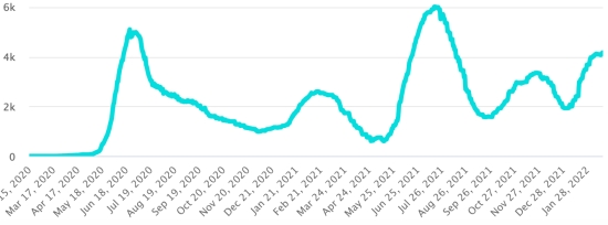 (Jour-1) Vaccination : 548,31 millions de doses de vaccin injectées depuis le 14 décembre 2020 date de la première injection aux États-Unis (+230,000 doses en 24h). Mise à jour 17 février 2022 (dernières données disponibles). RÉPUBLIQUE DOMINICAINE : Cas confirmés depuis le 1er mars 2020 : 570,636 cas (+400 en 24h) la veille (+534). Premier cas (1er mars 2020) Guérisons : 563,757 guérisons (+514), la veille (+481) Taux national de Guérison : 98,79% (+) Décès : 4,351 décès (+2 en 24h), la veille (+2) Taux de mortalité : 0,76% (=) Taux de positivité sur 4 semaines épidémiologiques : 10,24% (-) Cas actifs : (excluant décès et guérisons) 2,528 cas (-116 en 24h) la veille (+51) République Dominicaine : Tendance cas actifs : (moins guérisons et décès)