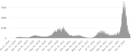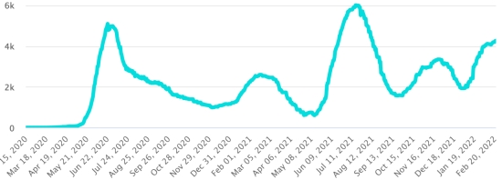 (Jour-1) Vaccination : 550,79 millions de doses de vaccin injectées depuis le 14 décembre 2020 date de la première injection aux États-Unis (+230,000 doses en 24h). Mise à jour 22 février 2022 (dernières données disponibles). RÉPUBLIQUE DOMINICAINE : Cas confirmés depuis le 1er mars 2020 : 572,290 cas (+434 en 24h) la veille (+304). Premier cas (1er mars 2020) Guérisons : 565,641 guérisons (+415), la veille (+405) Taux national de Guérison : 98,83% (-) Décès : 4,357 décès (+0 en 24h), la veille (+0) Taux de mortalité : 0,76% (=) Taux de positivité sur 4 semaines épidémiologiques : 6,9% (-) Cas actifs : (excluant décès et guérisons) 2,292 cas (+19 en 24h) la veille (-101) République Dominicaine : Tendance cas actifs : (moins guérisons et décès)