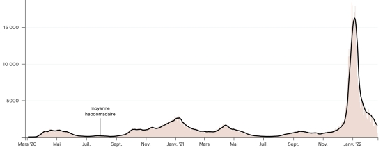 Test : 16,584,963 personnes testées depuis le premier cas (+50,785 en 72h) Vaccination : 18,327,288 doses de vaccin injectées depuis le 14 décembre 2020 date de la première injection (+47,796 doses en 72h), dernières données disponibles - MSSS en date du 21 février 2022) FRANCE : *Cas confirmés depuis le premier cas (24 janvier 2020) : 22,304,024 cas (+ 17,195 cas en 24h), précédent (+59,003) *Guérisons : 19,424,964 guérisons (+420,828 en 24h), précédent (+82,657) Taux national de Guérison : 87,09% (+) Décès : 132,662 décès (correction à la baisse Santé Public France), précédent (+79) Taux de mortalité : 0,59% (=) Cas Actifs : 2,746,398 (-399,701 en 24h), précédent (-23,654) Test : 243,529,298 (dernière donnée disponible 17 février 2022) France : Tendance cas actifs : (moins guérisons et décès)