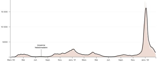 (Jour-1) TOP 5 des Provinces ayant le plus de nouveaux cas les dernières 24h : District National : +93 nouveaux cas en 24h (-55 par rapport à la veille) Santo Domingo : +91 nouveaux cas en 24h (-27 par rapport à la veille) Santiago : +19 nouveaux cas en 24h (+8 par rapport à la veille) San Pedro de Macoris : +18 nouveaux cas en 24h () Puerto Plata : +10 nouveaux cas en 24h () Tests (depuis le 1er cas) : 3,084,256 tests (+6,637 en 24h), la veille (+5,759) Vaccination : 15,21 millions de doses de vaccin injectées depuis le 16 février 2021, date de la première injection en République Dominicaine (+20,000 doses injectées en 24h). Mise à jour 22 février 2022 (dernières données disponibles). QUÉBEC : Cas confirmés depuis le premier cas (27 février 2020) : 913,901 (+1,438 en 24h), précédent (+4,007 en 72h) Guérisons : 880,748 personnes (+2,305 en 24h), précédent (+8,000 en 72h) Taux de guérison : 96,37% (+) Décès : 13,886 décès (+30 en 24h), précédent (+21 en 72h) Taux de mortalité : 1,51% (=) Cas actifs : (excluant décès et guérison) 19,267 cas (-897 en 24h), précédent (-3,950 en 72h) Québec : Tendance cas confirmés :