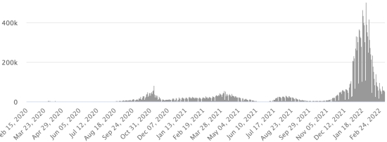 (Jour-1) Vaccination : 10,95 millards de doses de vaccin injectées (+30 millions de doses injectées en 24h. Mise à jour 7 mars 2022 (dernières données disponibles). HAÏTI : Situation épidémiologique : Selon le Ministère de la Santé Publique, +18 nouveaux cas de Covid-19 et de ses variants auraient été confirmés en Haïti en date du 3 mars 2022 (dernières données partielles disponibles) pour un total de 30,400 cas confirmés sur l’ensemble du territoire national (48,7% de femmes et 51,3% hommes), depuis le premier cas (19 mars 2020 https://www.haitilibre.com/article-30319-haiti-sante-origine-des-2-premiers-cas-de-covid-19-en-haiti.html ). Précédente mise à jour (+32 cas en date du 1er mars 2022). Guérisons : 25,485 (+45) Taux de guérison : 83,83% (+) Décès : 825 décès (+5) (Ouest +1, Centre +3, Artibonite +1) Taux de mortalité : 2,71% (+) 5ème vague (Omicron dominant) : Total de la 5ème vague (début 27 décembre 2021) s’élève à 4,405 cas confirmés et 59 décès Haïti : Tendance cas actifs : (moins guérisons et décès)