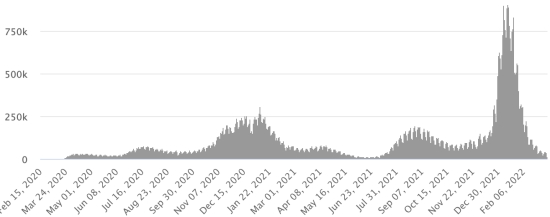 (tendance moyenne hebdomadaire) Test : 16,850,668 personnes testées depuis le premier cas (+13,992 en 24h) Vaccination : 18,505,552 doses de vaccin injectées depuis le 14 décembre 2020 date de la première injection (+7,894 doses en 24h), dernières données disponibles - MSSS en date du 12 mars 2022) FRANCE : *Cas confirmés depuis le premier cas (24 janvier 2020) : 23,514,144 cas (+60,422 cas en 24h), précédent (+72,443) *Guérisons : 22,261,297 guérisons (+114,548 en 24h), précédent (+58,952) Taux national de Guérison : 94,18% (-) Décès : 140,109 décès (+29 en 24h), précédent (+51) Taux de mortalité : 0,59% (=) Cas Actifs : 1,112,738 (-54,155 en 24h), précédent (+13,440) Test : 246,629,975 (dernière donnée disponible 27 février 2022) France : Nombre de cas confirmés quotidiens :