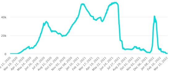 (Jour-1) Vaccination : 557,96 millions de doses de vaccin injectées depuis le 14 décembre 2020 date de la première injection aux États-Unis (+230,000 doses en 24h). Mise à jour 17 mars 2022 (dernières données disponibles). RÉPUBLIQUE DOMINICAINE : Cas confirmés depuis le 1er mars 2020 : 576,904 cas (+116 en 24h) la veille (+90 en 24h). Premier cas (1er mars 2020) Guérisons : 572,092 guérisons (+64 en 24h), la veille (+22) Taux national de Guérison : 99,16% (-) Décès : 4,375 décès (+1), précédent (+0) Taux de mortalité : 0,75% (=) Taux de positivité sur 4 semaines épidémiologiques : 1,45% (-) Cas actifs : (excluant décès et guérisons) 437 cas (+51 en 24h) la veille (+68) République Dominicaine : Tendance cas actifs : (moins guérisons et décès)