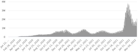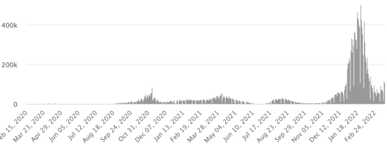 SITUATION MONDIALE 2019-2022 : Situation épidémiologique : Vendredi 18 mars 2022 le nombre de personnes contaminées dans le monde par le coronavirus Covid-19 et ses variants depuis le début de la pandémie (11 mars 2020) s’élève à 466,638,012 cas (+2,098,587 en 24h), la veille (+2,428,466) Nombre de pays contaminés : 224 *Guérisons : 398,323,550 personnes ont été guéries du Covid-19 dans le monde (+1,458,694 en 24h), la veille (+1,552,488) *Décès : 6,088,849 personnes sont mortes du Covid-19 dans le monde (+6,733 en 24h), la veille (+7,513) *Cas actifs (moins décès et guérisons) dans le monde est actuellement de 62,225,613 cas (+633,160 en 24h), la veille (+868,465) Taux moyen de guérison au monde : 85,36% (-) Taux moyen de mortalité au monde : 1,30% (=) Monde : Nombre de cas confirmés quotidiens :