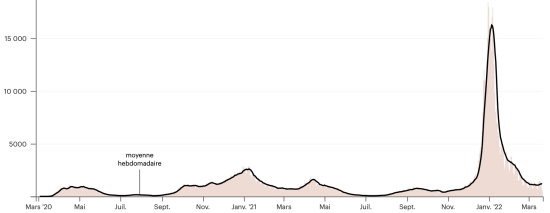 (tendance moyenne hebdomadaire) Vaccination : 18,571,415 doses de vaccin injectées depuis le 14 décembre 2020 date de la première injection (+21,417 doses en 72h), dernières données disponibles - MSSS en date du 21 mars 2022) FRANCE : *Cas confirmés depuis le premier cas (24 janvier 2020) : 24,161,339 cas (+24,179 cas en 24h), précédent (+81,2283) *Guérisons : 22,641,524 guérisons (+79,642), précédent (+13,453) Taux national de Guérison : 93,70% (+) Décès : 141,085 (+152 en 24h), précédent (+30) Taux de mortalité : 0,58% (=) Cas Actifs : 1,378,730 (-55,615), précédent (+67.800) France : Nombre de cas confirmés quotidiens :