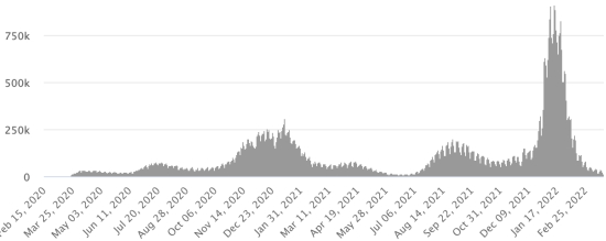 (Jour-1) Vaccination : 558,84 millions de doses de vaccin injectées depuis le 14 décembre 2020 date de la première injection aux États-Unis (+180,000 doses en 24h). Mise à jour 21 mars 2022 (dernières données disponibles). RÉPUBLIQUE DOMINICAINE : Cas confirmés depuis le 1er mars 2020 : 577,338 cas (+21 en 24h) la veille (+76 en 24h). Premier cas (1er mars 2020) Guérisons : 572,434 guérisons (+68 en 24h), la veille (+77) Taux national de Guérison : 99,15% (+) Décès : 4,375 décès (+0), précédent (+0) Taux de mortalité : 0,75% (=) Taux de positivité sur 4 semaines épidémiologiques : 1,21% (-) Cas actifs : (excluant décès et guérisons) 529 cas (-47 en 24h) la veille (-1) République Dominicaine : Nombre de cas confirmés quotidiens :