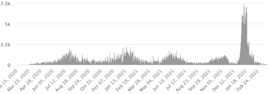 SITUATION MONDIALE 2019-2022 : Situation épidémiologique : Samedi 26 mars 2022 le nombre de personnes contaminées dans le monde par le coronavirus Covid-19 et ses variants depuis le début de la pandémie (11 mars 2020) s’élève à 480,082,835 cas (+1,805,717 en 24h), la veille (+1,685,737) Nombre de pays contaminés : 224 *Guérisons : 414,493,135 personnes ont été guéries du Covid-19 dans le monde (+1,382,4121), la veille (+1,170,306) *Décès : 6,143,626 personnes sont mortes du Covid-19 dans le monde depuis le début de la pandémie (+9,649 en 24h), la veille (+5,045) *Cas actifs (moins décès et guérisons) dans le monde est actuellement de 59,446,074 cas (+413,647 en 24h), la veille (+510,386) Taux moyen de guérison au monde : 86,33% (-) Taux moyen de mortalité au monde : 1,27% (-) Monde : Nombre de cas confirmés quotidiens :