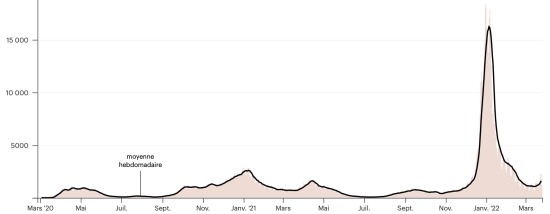 (tendance moyenne hebdomadaire) Vaccination : 18,592,149 doses de vaccin injectées depuis le 14 décembre 2020 date de la première injection (+8,064 doses en 24h), dernières données disponibles - MSSS en date du 25 mars 2022) FRANCE : *Cas confirmés depuis le premier cas (24 janvier 2020) : 24,779,882 cas (+143,571 cas en 24h), précédent (+148,635) *Guérisons : 22,870,434 guérisons (+53,557), précédent (-124 correction Santé publique France) Taux national de Guérison : 92,29% (-) Décès : 141,564 (+121 en 24h), précédent (+124) Taux de mortalité : 0,57% (=) Cas Actifs : 1,767,884 (+89,893), précédent (+148,635) France : Tendance cas actifs : (moins guérisons et décès)