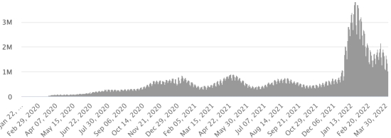 (Jour-1) Vaccination : 11,39 millards de doses de vaccin injectées (+20 millions de doses injectées en 24h. Mise à jour 3 avril 2022 (dernières données disponibles). HAÏTI : Avertissement : Le Ministère de la Santé Publique et de la Population (MSPP) n’as pas rendu disponible après le 26 mars 2022 les données quotidiennes sur la situation du Covid-19 en Haïti. En conséquence, les données ci-dessous sur la situation en Haïti sont les dernières disponibles. Selon le Ministère de la Santé Publique, +16 nouveaux cas de Covid-19 et de ses variants auraient été confirmés en Haïti en date du 26 mars 2022 (dernières données partielles disponibles) pour un total de 30,545 cas confirmés sur l’ensemble du territoire national (48,7% de femmes et 51,3% hommes), depuis le premier cas (19 mars 2020 https://www.haitilibre.com/article-30319-haiti-sante-origine-des-2-premiers-cas-de-covid-19-en-haiti.html ). Précédente mise à jour (+7 cas en date du 24mars 2022). Guérisons : 28,431 (+162) Taux de guérison : 93,07% (+) Décès : 833 décès (+0) () Taux de mortalité : 2,72% (=) 5ème vague (Omicron dominant) : Total de la 5ème vague (début 27 décembre 2021) 4,551 cas confirmés et 67 décès Dépistage depuis le début de la pandémie : 188,012 tests (+690 en 2 jours) depuis le 19 mars 2020, dernières données disponibles. Notez que la très petite quantité de personnes dépistées chaque jour à l’échelon national sur une population estimé à 11,6 millions de citoyens, ne permet pas statistiquement de faire une estimation représentative de la situation en Haïti, ce qui se traduit par un nombre de cas confirmés quotidiennement largement sous évalué. TOP 5 des Communes les plus touchées dans l’Ouest (2022) : Delmas : 740 (+1) ; Pétion-ville 624 (+3) ; Port-au-Prince 406 (+0) ; Tabarre 287 (+0) ; Croix-des-Bouquets 239 (+1) Cas confirmés par département (2022 / 2021 / 2020) : Ouest : 2022 : 2,552 cas ; (2021 : 9,890) ; (2020 : 6,945 cas) Nord : 2022 : 267 cas ; (2021 : 664) ; (2020 : 677 cas) Centre : 2022 : 226 cas ; (2021 : 1,001) ; (2020 : 508 cas) Artibonite : 2022 : 184 cas ; (2021 : 855) ; (2020 : 593 cas) Nord-Est : 2022 : 148 cas ; (2021 : 404) ; (2020 : 314 cas) Sud-Est : 2022: 262 cas ; (2021 : 768) ; (2020 : 274 cas) Sud : 2022 : 214 cas ; (2021 : 891) ; (2020 : 262 cas) Nord-Ouest : 2022 : 255 cas ; (2021 : 383) ; (2020 : 229 cas) Grand'Anse : 2022 : 173 cas ; (2021 : 861) ; (2020 : 176 cas) Nippes : 2022 : 39 cas ; (2021 : 249) (2020 : 149 cas) Décès cumulés par département (2022-2021) : Ouest : 295 décès (2020 : 104 décès) Nord : 54 décès (2020 : 34 décès) Centre : 79 décès (2020 : 13 décès) Artibonite : 42 décès (2020 : 39 décès) Nord-Est : 7 décès (2020 : 6 décès) Sud : 51 décès (2020 : 6 décès) Sud-Est : 15 décès (2020 : 9 décès) Nord-Ouest : 15 décès (2020 : 12 décès) Grand'Anse : 7 décès (2020 : 13 décès) Nippes : 27 décès (2020 : 5 décès) Répartition des décès par âge (depuis le début de l’épidémie) : 0-9 ans : 15 décès 10-19 ans : 10 décès 20-29 ans : 31 décès 30-39 ans : 56 décès 40-49 ans : 80 décès 50-59 ans : 134 décès 60-69 ans : 187 décès 70-79 ans : 183 décès 80 ans et plus : 137 décès Vaccination : 163,369 haïtiens (1,4% de la population) +2,205 en 6 jours ont reçu une 1ère dose de vaccin depuis le 16 juillet 2021 date de la première injection à travers 149 centres de vaccinations ouverts et 111,914 haïtiens sont entièrement vaccinés (2 doses, 0,96% de la population) +1,585 en 6 jours. Mise à jour 22 mars 2022 dernières informations disponibles (source MSPP). Liste des 149 Centres de vaccination ouverts en Haïti (et horaires) par département : (mise à jour 20 octobre 2021, dernières informations disponibles) DIASPORA : Situation épidémiologique : USA : *Cas depuis le premier cas (29 février 2020) : 81,832,612 cas (+6,241 en 24h), la veille (+12,856) *Guérisons : 65,676,514 guérisons (+150,540), la veille (+142,983) Taux national de Guérison : 80,25% (+) *Décès : 1,008,198 décès (+39), la veille (+170) Taux national de mortalité : 1,23% (=) *Cas actifs (moins décès et guérisons) : 15,147,900 (-144,338), la veille (-130,297) USA : Nombre de cas confirmés quotidiens :