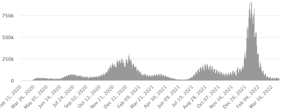 (Jour-1) Vaccination : 563,88 millions de doses de vaccin injectées depuis le 14 décembre 2020 date de la première injection aux États-Unis (+630,000). Mise à jour 7 avril (dernières données disponibles). RÉPUBLIQUE DOMINICAINE : Cas confirmés depuis le 1er mars 2020 : 578,377 cas (+58 en 24h) la veille (+55 en 24h). Premier cas (1er mars 2020) Guérisons : 573,885 guérisons (+71 en 24h), la veille (+91) Taux national de Guérison : 99,22% (+) Décès : 4,375 décès (+0), précédent (+0) Taux de mortalité : 0,75% (=) Taux de positivité sur 4 semaines épidémiologiques : 0,95% (=) Cas actifs : (excluant décès et guérisons) 117 cas (-13 en 24h) la veille (-25) République Dominicaine : Nombre de cas confirmés quotidiens :