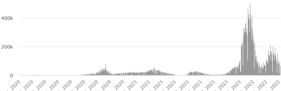 SITUATION MONDIALE 2019-2022 : Situation épidémiologique : Vendredi 29 avril 2022 le nombre de personnes contaminées dans le monde par le coronavirus Covid-19 et ses variants depuis le début de la pandémie (11 mars 2020) s’élève à 512,300,182 cas (+690,837 en 24h), la veille (+691,505) Nombre de pays contaminés : 225 *Guérisons : 466,155,230 personnes ont été guéries du Covid-19 dans le monde (+818.782 en 24h), la veille (+1,163,804) *Décès : 6,256,835 personnes sont mortes du Covid-19 dans le monde depuis le début de la pandémie (+3,170 en 24h), la veille (+4,328) *Cas actifs (moins décès et guérisons) dans le monde est actuellement de 39,888,117 cas (-131,115 en 24h), la veille (-476,627) Taux moyen de guérison au monde : 90,99% (+) Taux moyen de mortalité au monde : 1,22% (=) Monde : Nombre de cas confirmés quotidiens :