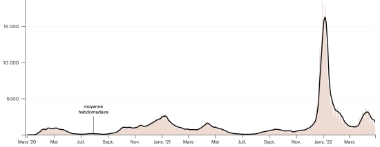 (tendance moyenne hebdomadaire) Vaccination : 19,427,024 doses de vaccin injectées depuis le 14 décembre 2020 date de la première injection (+31,995 doses en 24h), dernières données disponibles - MSSS en date du 20 avril 2022) FRANCE : *Cas confirmés depuis le premier cas (24 janvier 2020) : 28,542,884 cas (+59,760 cas en 24h), la veille (+67,711) *Guérisons : 26,552,320 guérisons (+148,636), la veille (+158,640) Taux national de Guérison : 93,02% (+) Décès : 145,711 décès (+132 en 24h), la veille (+152) Taux de mortalité : 0,51% (=) Cas Actifs : 1,844,853 (-89,008 en 24h), la veille (-91,081) France : Nombre de cas confirmés quotidiens :