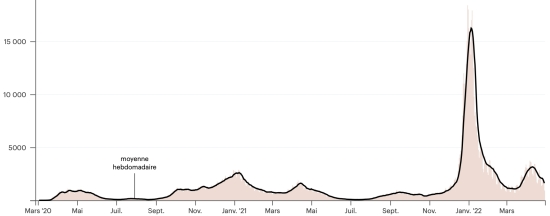 (tendance moyenne hebdomadaire) Vaccination : 19,461,432 doses de vaccin injectées depuis le 14 décembre 2020 date de la première injection (+32,637 doses en 24h), dernières données disponibles - MSSS) FRANCE : *Cas confirmés depuis le premier cas (24 janvier 2020) : 28,595,803 cas (+52,919 cas en 24h), la veille (+59,760) *Guérisons : 26,693,852 guérisons (+141,532), la veille (+148,636) Taux national de Guérison : 93,34% (+) Décès : 145,869 décès (+158 en 24h), la veille (+132) Taux de mortalité : 0,51% (=) Cas Actifs : 1,756,082 (-88,771 en 24h), la veille (-89,008) France : Nombre de cas confirmés quotidiens :