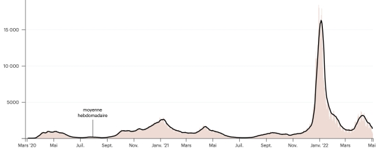 (tendance moyenne hebdomadaire) Vaccination : 19,538,360 doses de vaccin injectées depuis le 14 décembre 2020 date de la première injection (+12,968 doses en 24h), dernières données disponibles - MSSS) FRANCE : *Cas confirmés depuis le premier cas (24 janvier 2020) : 28,757,765 cas (+67,018 cas en 24h), la veille (+8,737) *Guérisons : 27,163,793 guérisons (+120 en 24h), la veille (+337,008) Taux national de Guérison : 94,45% (+) Décès : 146,262 décès (+120 en 24h), la veille (+180) Taux de mortalité : 0,50% (=) Cas Actifs : 1,447,710 (+67,017 en 24h), la veille (-328,451) France : Nombre de cas confirmés quotidiens :