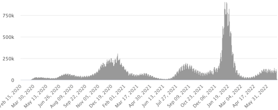 Vaccination : 597,10 millions de doses de vaccin injectées depuis le 14 décembre 2020 date de la première injection aux États-Unis (+210,000 doses). (Dernières données disponibles). RÉPUBLIQUE DOMINICAINE : Cas confirmés depuis le 1er mars 2020 : 606,812 cas (+1,028 en 24h), la veille (+1,014). Premier cas (1er mars 2020) Guérisons : 598,584 guérisons (-114 cas, correction Direction centrale d'épidémiologie dominicaine), la veille (+2,312) Taux national de Guérison : 98,64% (-) Décès : 4,383 décès (+0), la veille (+0) Taux de mortalité : 0,72% (=) Taux de positivité sur 4 semaines épidémiologiques : 13,09% (+) Cas actifs : (excluant décès et guérisons) 3,845 cas (+1,142 en 24h) la veille (-1,298) République Dominicaine : Nombre de cas confirmés quotidiens :