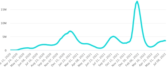 Lundi 11 juillet 2022 le nombre de personnes contaminées dans le monde par le coronavirus Covid-19 et ses variants depuis le début de la pandémie (11 mars 2020) s’élève à 560,801,988 cas (+428,956 en 24h), la veille (+506,376)