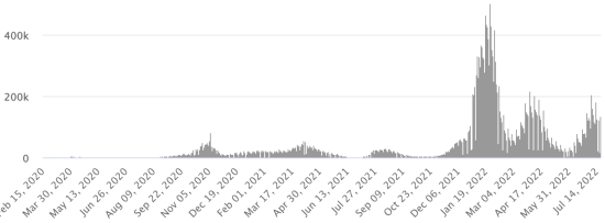 SITUATION MONDIALE 2019-2022 : Situation épidémiologique : Jeudi 21 juillet 2022 le nombre de personnes contaminées dans le monde par le coronavirus Covid-19 et ses variants depuis le début de la pandémie (11 mars 2020) s’élève à 571,758,740 cas (+1,862,803 en 24h), la veille (+1,157,754 en 24h) Nombre de pays contaminés : 228 *Guérisons : 541,896,866 personnes ont été guéries du Covid-19 dans le monde (+843,527 en 24h), la veille (+1,048,347 en 24h) *Décès : 6,396,282 personnes sont mortes du Covid-19 dans le monde depuis le début de la pandémie (+4,121 en 24h), la veille (+2,507 en 24h) *Cas actifs (moins décès et guérisons) dans le monde est actuellement de 23,465,592 cas (+1,015,155 en 24h), la veille (+106,900 en 24h) Taux de guérison au monde : 94,77% (-) Taux de mortalité au monde : 1,11% (-) Monde : Nombre de cas confirmés quotidiens :