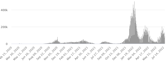 SITUATION MONDIALE 2019-2022 : Situation épidémiologique : Vendredi 22 juillet 2022 le nombre de personnes contaminées dans le monde par le coronavirus Covid-19 et ses variants depuis le début de la pandémie (11 mars 2020) s’élève à 572,872,334 cas (+1,113,594 en 24h), la veille (+1,862,803 en 24h) Nombre de pays contaminés : 228 *Guérisons : 542,881,117 personnes ont été guéries du Covid-19 dans le monde (+984,251 en 24h), la veille (+843,527 en 24h) *Décès : 6,398,648 personnes sont mortes du Covid-19 dans le monde depuis le début de la pandémie (+2,366 en 24h), la veille (+4,121 en 24h) *Cas actifs (moins décès et guérisons) dans le monde est actuellement de 23,592,569 cas (+126,977 en 24h), la veille (+1,015,155 en 24h) Taux de guérison au monde : 94,76% (-) Taux de mortalité au monde : 1,11% (=) Monde : Nombre de cas confirmés quotidiens :