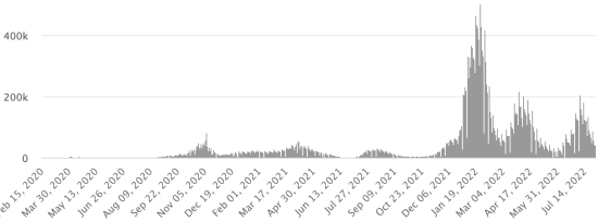 Vaccination : 12,37 millards de doses de vaccin injectées (+10 millions de doses). (Dernières données disponibles). HAÏTI : Avertissement : Le Ministère de la Santé Publique et de la Population (MSPP) n'as pas rendu disponible après le 22 juillet 2022 les données quotidiennes sur la situation du Covid-19 en Haïti. En conséquence, les données ci-dessous sur la situation en Haïti sont les dernières disponibles. Selon le Ministère de la Santé Publique, +15 nouveaux cas de Covid-19 et de ses variants auraient été confirmés en Haïti en date du 22 juillet 2022 (dernières données partielles disponibles) pour un total de 32,263 cas confirmés sur l’ensemble du territoire national (48,9% de femmes et 51,1% hommes), depuis le premier cas (19 mars 2020 https://www.haitilibre.com/article-30319-haiti-sante-origine-des-2-premiers-cas-de-covid-19-en-haiti.html ). Précédente mise à jour (+25 cas en date du 20 juillet 2022). Guérisons : 29,970 (+5) Taux de guérison : 92,89% (-) Décès : 838 décès (+0) Taux de mortalité : 2,59% (=) Dépistage depuis le début de la pandémie : 212,540 tests depuis le 19 mars 2020 (+79 en 2 jours) un nombre de tests pour l’ensemble du territoire national, insuffisant statistiquement pour être représentatif de la situation sanitaire, ce qui se traduit par un nombre de cas confirmés quotidiennement largement sous-évalué de l’avis des spécialistes de la santé. TOP 5 des Communes les plus touchées dans l’Ouest (2022) : Delmas : 1,011 (+10) ; Pétion-ville 760 (+0) ; Port-au-Prince 493 (+4) ; Tabarre 426 (+1) ; Croix-des-Bouquets 354 (+0) Cas confirmés par département (2022 / 2021 / 2020) : Ouest : 2022 : 3,399 (+) cas ; (2021 : 9,890) ; (2020 : 6,945 cas) Nord : 2022 : 355 (=) cas ; (2021 : 664) ; (2020 : 677 cas) Centre : 2022 : 357 (=) cas ; (2021 : 1,001) ; (2020 : 508 cas) Artibonite : 2022 : 279 (=) cas ; (2021 : 855) ; (2020 : 593 cas) Nord-Est : 2022 : 253 (=) cas ; (2021 : 404) ; (2020 : 314 cas) Sud-Est : 2022 : 357 (=) cas ; (2021 : 768) ; (2020 : 274 cas) Sud : 2022 : 293 (=) cas ; (2021 : 891) ; (2020 : 262 cas) Nord-Ouest : 2022 : 387 (=) cas ; (2021 : 383) ; (2020 : 229 cas) Grand'Anse : 2022 : 242 (=) cas ; (2021 : 861) ; (2020 : 176 cas) Nippes : 2022 : 116 (=) cas ; (2021 : 249) (2020 : 149 cas) Décès cumulés par département (2022-2021) : Ouest : 299 décès (2020 : 104 décès) Nord : 54 décès (2020 : 34 décès) Centre : 79 décès (2020 : 13 décès) Artibonite : 42 décès (2020 : 39 décès) Nord-Est : 7 décès (2020 : 6 décès) Sud : 51 décès (2020 : 6 décès) Sud-Est : 15 décès (2020 : 9 décès) Nord-Ouest : 15 décès (2020 : 12 décès) Grand'Anse : 7 décès (2020 : 13 décès) Nippes : 27 décès (2020 : 5 décès) Répartition des décès par âge (depuis le début de l’épidémie) : 0-9 ans : 15 décès 10-19 ans : 10 décès 20-29 ans : 31 décès 30-39 ans : 56 décès 40-49 ans : 80 décès 50-59 ans : 135 décès 60-69 ans : 188 décès 70-79 ans : 185 décès (+1) 80 ans et plus : 138 décès Vaccination : 248,075 haïtiens (2,13% de la population) +1,828 en 21 jours ont reçu une 1ère dose de vaccin depuis le 16 juillet 2021 date de la première injection à travers 149 centres de vaccinations ouverts et 161,066 haïtiens sont entièrement vaccinés (2 doses, 1,38% de la population) +1,723 en 21 jours. Mise à jour 10 juillet 2022 dernières informations disponibles (source MSPP). Liste des 149 Centres de vaccination ouverts en Haïti (et horaires) par département : (mise à jour 20 octobre 2021, dernières informations disponibles) DIASPORA : Situation épidémiologique : USA : *Cas depuis le premier cas (29 février 2020) : 93,082,195 cas (+12,332 en 24h), la veille (+15,679 en 24h) *Guérisons : 88,215,008 guérisons (+113,559 en 24h), la veille (+89,666 en 24h) Taux national de Guérison : 94,77% (+) *Décès : 1,055,059 (+8 en 24h), la veille (+31 en 24h) Taux de mortalité : 1,13% (=) *Cas actifs (moins décès et guérisons) : 3,812,128 (-101,235 en 24h), la veille (+74,018 en 24h) USA : Nombre de cas confirmés quotidiens :