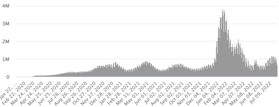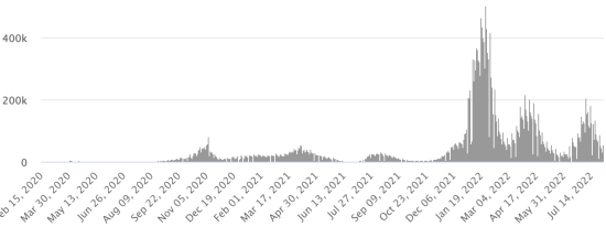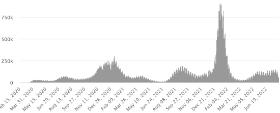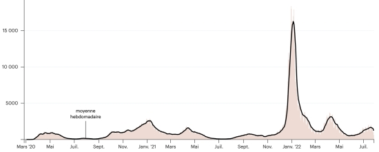Vaccination : 12,37 millards de doses de vaccin injectées (+10 millions de doses). (Dernières données disponibles). HAÏTI : Avertissement : Le Ministère de la Santé Publique et de la Population (MSPP) n'as pas rendu disponible après le 24 juillet 2022 les données quotidiennes sur la situation du Covid-19 en Haïti. En conséquence, les données ci-dessous sur la situation en Haïti sont les dernières disponibles. Selon le Ministère de la Santé Publique, +9 nouveaux cas de Covid-19 et de ses variants auraient été confirmés en Haïti en date du 24 juillet 2022 (dernières données partielles disponibles) pour un total de 32,272 cas confirmés sur l’ensemble du territoire national (48,9% de femmes et 51,1% hommes), depuis le premier cas (19 mars 2020 https://www.haitilibre.com/article-30319-haiti-sante-origine-des-2-premiers-cas-de-covid-19-en-haiti.html ). Précédente mise à jour (+15 cas en date du 22 juillet 2022). Guérisons : 29,991 (+21) Taux de guérison : 92,93% (+) Décès : 838 décès (+0) Taux de mortalité : 2,59% (=) Dépistage depuis le début de la pandémie : 212,646 tests depuis le 19 mars 2020 (+106 en 2 jours) un nombre de tests pour l’ensemble du territoire national, insuffisant statistiquement pour être représentatif de la situation sanitaire, ce qui se traduit par un nombre de cas confirmés quotidiennement largement sous-évalué de l’avis des spécialistes de la santé. TOP 5 des Communes les plus touchées dans l’Ouest (2022) : Delmas : 1,012 (+1) ; Pétion-ville 760 (+0) ; Port-au-Prince 495 (+2) ; Tabarre 429 (+3) ; Croix-des-Bouquets 354 (+0) Cas confirmés par département (2022 / 2021 / 2020) : Ouest : 2022 : 3,405 (+) cas ; (2021 : 9,890) ; (2020 : 6,945 cas) Nord : 2022 : 356 (+) cas ; (2021 : 664) ; (2020 : 677 cas) Centre : 2022 : 357 (=) cas ; (2021 : 1,001) ; (2020 : 508 cas) Artibonite : 2022 : 279 (=) cas ; (2021 : 855) ; (2020 : 593 cas) Nord-Est : 2022 : 253 (=) cas ; (2021 : 404) ; (2020 : 314 cas) Sud-Est : 2022 : 357 (=) cas ; (2021 : 768) ; (2020 : 274 cas) Sud : 2022 : 294 (+) cas ; (2021 : 891) ; (2020 : 262 cas) Nord-Ouest : 2022 : 388 (+) cas ; (2021 : 383) ; (2020 : 229 cas) Grand'Anse : 2022 : 242 (=) cas ; (2021 : 861) ; (2020 : 176 cas) Nippes : 2022 : 116 (=) cas ; (2021 : 249) (2020 : 149 cas) Décès cumulés par département (2022-2021) : Ouest : 299 décès (2020 : 104 décès) Nord : 54 décès (2020 : 34 décès) Centre : 79 décès (2020 : 13 décès) Artibonite : 42 décès (2020 : 39 décès) Nord-Est : 7 décès (2020 : 6 décès) Sud : 51 décès (2020 : 6 décès) Sud-Est : 15 décès (2020 : 9 décès) Nord-Ouest : 15 décès (2020 : 12 décès) Grand'Anse : 7 décès (2020 : 13 décès) Nippes : 27 décès (2020 : 5 décès) Répartition des décès par âge (depuis le début de l’épidémie) : 0-9 ans : 15 décès 10-19 ans : 10 décès 20-29 ans : 31 décès 30-39 ans : 56 décès 40-49 ans : 80 décès 50-59 ans : 135 décès 60-69 ans : 188 décès 70-79 ans : 185 décès (+1) 80 ans et plus : 138 décès Vaccination : 248,075 haïtiens (2,13% de la population) +1,828 en 21 jours ont reçu une 1ère dose de vaccin depuis le 16 juillet 2021 date de la première injection à travers 149 centres de vaccinations ouverts et 161,066 haïtiens sont entièrement vaccinés (2 doses, 1,38% de la population) +1,723 en 21 jours. Mise à jour 10 juillet 2022 dernières informations disponibles (source MSPP). Liste des 149 Centres de vaccination ouverts en Haïti (et horaires) par département : (mise à jour 20 octobre 2021, dernières informations disponibles) DIASPORA : Situation épidémiologique : USA : *Cas depuis le premier cas (29 février 2020) : 93,319,702 cas (+94,592 en 24h), la veille (+142,915 en 24h) *Guérisons : 88,431,777 guérisons (+108,209 en 24h), la veille (+108,560 en 24h) Taux national de Guérison : 94,76% (+) *Décès : 1,055,975 (+399 en 24h), la veille (+517 en 24h) Taux de mortalité : 1,13% (=) *Cas actifs (moins décès et guérisons) : 3,831,950 (-14,016 en 24h), la veille (+33,838 en 24h) USA : Nombre de cas confirmés quotidiens :
