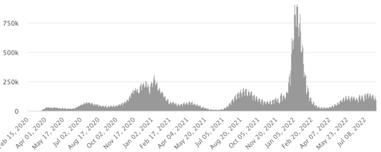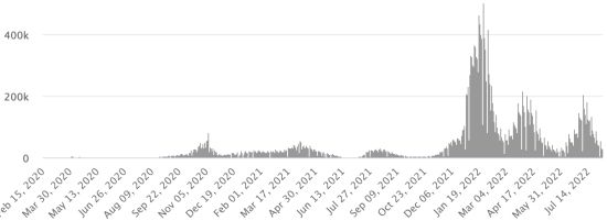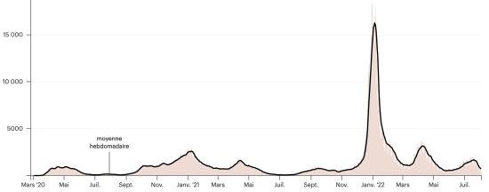Vaccination : 12,50 millards de doses de vaccin injectées (+130 millions de doses). (Dernières données disponibles). HAÏTI : Avertissement : Le Ministère de la Santé Publique et de la Population (MSPP) n'as pas rendu disponible après le 30 juillet 2022 les données quotidiennes sur la situation du Covid-19 en Haïti. En conséquence, les données ci-dessous sur la situation en Haïti sont les dernières disponibles. Selon le Ministère de la Santé Publique, +168 nouveaux cas de Covid-19 et de ses variants auraient été confirmés en Haïti en date du 30 juillet 2022 (dernières données partielles disponibles) pour un total de 32,464 cas confirmés sur l’ensemble du territoire national (48,9% de femmes et 51,1% hommes), depuis le premier cas (19 mars 2020 https://www.haitilibre.com/article-30319-haiti-sante-origine-des-2-premiers-cas-de-covid-19-en-haiti.html ). Précédente mise à jour (+24 cas en date du 26 juillet 2022). Guérisons : 30,070 (+44) Taux de guérison : 92,62% (-) Décès : 838 décès (+0) Taux de mortalité : 2,58% (-) Dépistage depuis le début de la pandémie : 213,567 212,869 tests depuis le 19 mars 2020 (+698 en 4 jours) un nombre de tests pour l’ensemble du territoire national, insuffisant statistiquement pour être représentatif de la situation sanitaire, ce qui se traduit par un nombre de cas confirmés quotidiennement largement sous-évalué de l’avis des spécialistes de la santé. TOP 5 des Communes les plus touchées dans l’Ouest (2022) : Delmas : 1,040 (+18) ; Pétion-ville 760 (+88) ; Port-au-Prince 495 (+35) ; Tabarre 435 (+3) ; Croix-des-Bouquets 362 (+5) Cas confirmés par département (2022 / 2021 / 2020) : Ouest : 2022 : 3,574 (+) cas ; (2021 : 9,890) ; (2020 : 6,945 cas) Nord : 2022 : 358 (+) cas ; (2021 : 664) ; (2020 : 677 cas) Centre : 2022 : 357 (=) cas ; (2021 : 1,001) ; (2020 : 508 cas) Artibonite : 2022 : 282 (+) cas ; (2021 : 855) ; (2020 : 593 cas) Nord-Est : 2022 : 253 (=) cas ; (2021 : 404) ; (2020 : 314 cas) Sud-Est : 2022 : 357 (=) cas ; (2021 : 768) ; (2020 : 274 cas) Sud : 2022 : 298 (+) cas ; (2021 : 891) ; (2020 : 262 cas) Nord-Ouest : 2022 : 398 (+) cas ; (2021 : 383) ; (2020 : 229 cas) Grand'Anse : 2022 : 244 (+) cas ; (2021 : 861) ; (2020 : 176 cas) Nippes : 2022 : 118 (+) cas ; (2021 : 249) (2020 : 149 cas) Décès cumulés par département (2022-2021) : Ouest : 299 décès (2020 : 104 décès) Nord : 54 décès (2020 : 34 décès) Centre : 79 décès (2020 : 13 décès) Artibonite : 42 décès (2020 : 39 décès) Nord-Est : 7 décès (2020 : 6 décès) Sud : 51 décès (2020 : 6 décès) Sud-Est : 15 décès (2020 : 9 décès) Nord-Ouest : 15 décès (2020 : 12 décès) Grand'Anse : 7 décès (2020 : 13 décès) Nippes : 27 décès (2020 : 5 décès) Répartition des décès par âge (depuis le début de l’épidémie) : 0-9 ans : 15 décès 10-19 ans : 10 décès 20-29 ans : 31 décès 30-39 ans : 56 décès 40-49 ans : 80 décès 50-59 ans : 135 décès 60-69 ans : 188 décès 70-79 ans : 185 décès 80 ans et plus : 138 décès Vaccination : 249,913 haïtiens (2,15% de la population) +1,838 en 23 jours ont reçu une 1ère dose de vaccin depuis le 16 juillet 2021 date de la première injection à travers 149 centres de vaccinations ouverts et 162,599 haïtiens sont entièrement vaccinés (2 doses, 1,4% de la population) +1,533 en 23 jours. Mise à jour 3 août juillet 2022 dernières informations disponibles (source MSPP). Liste des 149 Centres de vaccination ouverts en Haïti (et horaires) par département : (mise à jour 20 octobre 2021, dernières informations disponibles) DIASPORA : Situation épidémiologique : USA : *Cas depuis le premier cas (29 février 2020) : 93,897,604 cas (+30,963 en 24h), la veille (+126,975 en 24h) *Guérisons : 88,933,126 guérisons (+109,830 en 24h), la veille (+122,327 en 24h) Taux national de Guérison : 94,71% (+) *Décès : 1,058,726 (+89 en 24h), la veille (+826 en 24h) Taux de mortalité : 1,12% (=) *Cas actifs (moins décès et guérisons) : 3,905,752 (-78,956 en 24h), la veille (+3,822 en 24h) USA : Nombre de cas confirmés quotidiens :