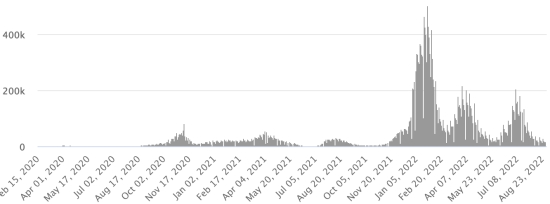 TOP 5 des Communes les plus touchées dans l’Ouest (2022) : Delmas : 1,195 (+30) ; Pétion-ville 1,053 (+4) ; Port-au-Prince 621 (+9) ; Tabarre 493 (+8) ; Croix-des-Bouquets 412 (+5) Cas confirmés par département (2022 / 2021 / 2020) : Ouest : 2022 : 4,213 (+) cas ; (2021 : 9,890) ; (2020 : 6,945 cas) Nord : 2022 : 384 (+) cas ; (2021 : 664) ; (2020 : 677 cas) Centre : 2022 : 398 (+) cas ; (2021 : 1,001) ; (2020 : 508 cas) Artibonite : 2022 : 368 (=) cas ; (2021 : 855) ; (2020 : 593 cas) Nord-Est : 2022 : 269 (+) cas ; (2021 : 404) ; (2020 : 314 cas) Sud-Est : 2022 : 382 (+) cas ; (2021 : 768) ; (2020 : 274 cas) Sud : 2022 : 322 (=) cas ; (2021 : 891) ; (2020 : 262 cas) Nord-Ouest : 2022 : 419 (=) cas ; (2021 : 383) ; (2020 : 229 cas) Grand'Anse : 2022 : 268 (+) cas ; (2021 : 861) ; (2020 : 176 cas) Nippes : 2022 : 133 (+) cas ; (2021 : 249) (2020 : 149 cas) Décès cumulés par département (2022-2021) : Ouest : 300 décès (2020 : 104 décès) Nord : 54 décès (2020 : 34 décès) Centre : 79 décès (2020 : 13 décès) Artibonite : 42 décès (2020 : 39 décès) Nord-Est : 7 décès (2020 : 6 décès) Sud : 51 décès (2020 : 6 décès) Sud-Est : 15 décès (2020 : 9 décès) Nord-Ouest : 16 décès (2020 : 12 décès) Grand'Anse : 7 décès (2020 : 13 décès) Nippes : 27 décès (2020 : 5 décès) Répartition des décès par âge (depuis le début de l’épidémie) : 0-9 ans : 15 décès 10-19 ans : 10 décès 20-29 ans : 32 décès 30-39 ans : 56 décès 40-49 ans : 81 décès 50-59 ans : 136 décès 60-69 ans : 188 décès 70-79 ans : 185 décès 80 ans et plus : 138 décès Vaccination : 254,833 haïtiens (2,19% de la population) +1,260 en 8 jours ont reçu une 1ère dose de vaccin depuis le 16 juillet 2021 date de la première injection à travers 149 centres de vaccinations ouverts et 167,428 haïtiens sont entièrement vaccinés (2 doses, 1,44% de la population) +1,418 en 8 jours. Mise à jour 25 août 2022 dernières informations disponibles (source MSPP). Liste des 149 Centres de vaccination ouverts en Haïti (et horaires) par département : (mise à jour 20 octobre 2021, dernières informations disponibles) DIASPORA : Situation épidémiologique : USA : *Cas depuis le premier cas (29 février 2020) : 96,149,016 cas (+57,896 en 24h), la veille (+79,265 en 24h) *Guérisons : 91,873,169 guérisons (+114,492 en 24h), la veille (+130,106 en 24h) Taux national de Guérison : 95,55% (+) *Décès : 1,069,748 (+249 cas en 24h), la veille (+367 en 24h) Taux de mortalité : 1,11% (=) *Cas actifs (moins décès et guérisons) : 3,206,099 cas (-56,845 en 24h), la veille (-51,208 en 24h) USA : Nombre de cas confirmés quotidiens :