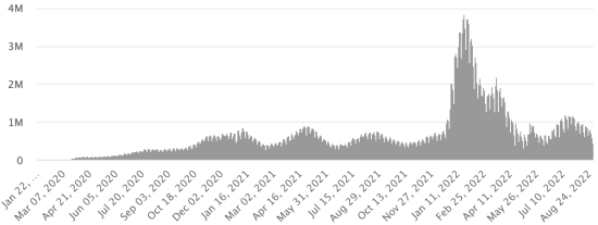 SITUATION MONDIALE 2019-2022 : Mercredi 31 août août 2022 le nombre de personnes contaminées dans le monde par le coronavirus Covid-19 et ses variants depuis le début de la pandémie (11 mars 2020) s’élève à 607,428,993 cas (+666,081 en 24h), la veille (+722.329 en 24h) Nombre de pays contaminés : 228 *Guérisons : 583,470,167 personnes ont été guéries du Covid-19 dans le monde (+867,162 en 24h), la veille (+1,050,757 en 24h) *Décès : 6,492,618 personnes sont mortes du Covid-19 dans le monde depuis le début de la pandémie (+2,228 en 24h), la veille (+1,964 en 24h) *Cas actifs (moins décès et guérisons) dans le monde est actuellement de 17,466,208 cas (-203,309 en 24h), la veille (-330,392 en 24h) Taux de guérison au monde : 96,05% (+) Taux de mortalité au monde : 1,06% (=) Monde : Nombre de cas confirmés quotidiens :