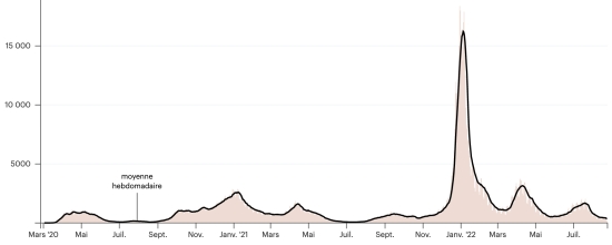 Vaccination : 20,714,723 de vaccin injectées depuis le 14 décembre 2020 date de la première injection (+13,639 doses en 24h, dernières données disponibles - MSSS) FRANCE : *Cas confirmés depuis le premier cas (24 janvier 2020) : 34,509,961 cas (+27,358 en 24h), la veille (+3,806 en 24h) *Guérisons : 33,990,930 guérisons (+27,009 en 24h), la veille (+38,120 en 24h) Taux national de Guérison : 98,49% (=) Décès : 154,039 décès (+72 en 24h), précédent (+110 en 72h) Taux de mortalité : 0,44% (=) Cas Actifs : 364,992 cas (+277 en 24h), la veille (-34,424 en 24h) France : Nombre de cas confirmés quotidiens :