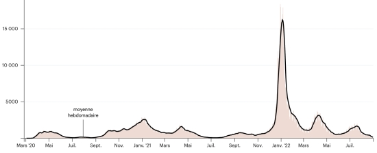 Vaccination : 12,66 millards de doses de vaccin injectées (+10 millions de doses). (Dernières données disponibles). HAÏTI : Avertissement : Le Ministère de la Santé Publique et de la Population (MSPP) n'as pas rendu disponible après le 24 août 2022 les données quotidiennes sur la situation du Covid-19 en Haïti. En conséquence, les données ci-dessous sur la situation en Haïti sont les dernières disponibles. Selon le Ministère de la Santé Publique, +86 nouveaux cas de Covid-19 et de ses variants auraient été confirmés en Haïti en date du 24 août 2022 (dernières données partielles disponibles) pour un total de 33,381 cas confirmés sur l’ensemble du territoire national (48,8% de femmes et 51,2% hommes), depuis le premier cas (19 mars 2020 https://www.haitilibre.com/article-30319-haiti-sante-origine-des-2-premiers-cas-de-covid-19-en-haiti.html ). Précédente mise à jour (+162 cas en date du 21 août 2022). Guérisons : 30,673 (+155) Taux de guérison : 91,88% (+) Décès : 841 décès (+0) Taux de mortalité : 2,51% (-) Dépistage depuis le début de la pandémie : 218,877 tests depuis le 19 mars 2020 (+718 en 3 jours) un nombre de tests pour l’ensemble du territoire national, insuffisant statistiquement pour être représentatif de la situation sanitaire, ce qui se traduit par un nombre de cas confirmés quotidiennement largement sous-évalué de l’avis des spécialistes de la santé. Haïti : Tendance cas actifs : (moins guérisons et décès)