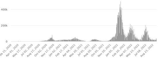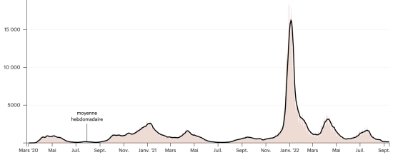 TOP 5 des Communes les plus touchées dans l’Ouest (2022) : Delmas : 1,243 (+2) ; Pétion-ville 1,112 (+2) ; Port-au-Prince 644 (+1) ; Tabarre 513 (+2) ; Croix-des-Bouquets 433 (+5) Cas confirmés par département (2022 / 2021 / 2020) : Ouest : 2022 : 4,415 (+) cas ; (2021 : 9,890) ; (2020 : 6,945 cas) Nord : 2022 : 393 (=) cas ; (2021 : 664) ; (2020 : 677 cas) Centre : 2022 : 416 (=) cas ; (2021 : 1,001) ; (2020 : 508 cas) Artibonite : 2022 : 400 (+) cas ; (2021 : 855) ; (2020 : 593 cas) Nord-Est : 2022 : 280 (+) cas ; (2021 : 404) ; (2020 : 314 cas) Sud-Est : 2022 : 384 (=) cas ; (2021 : 768) ; (2020 : 274 cas) Sud : 2022 : 329 (=) cas ; (2021 : 891) ; (2020 : 262 cas) Nord-Ouest : 2022 : 437 (=) cas ; (2021 : 383) ; (2020 : 229 cas) Grand'Anse : 2022 : 307 (+) cas ; (2021 : 861) ; (2020 : 176 cas) Nippes : 2022 : 135 (=) cas ; (2021 : 249) (2020 : 149 cas) Décès cumulés par département (2022-2021) : Ouest : 303 décès (2020 : 104 décès) Nord : 54 décès (2020 : 34 décès) Centre : 91 décès (2020 : 13 décès) Artibonite : 43 décès (2020 : 39 décès) Nord-Est : 7 décès (2020 : 6 décès) Sud : 51 décès (2020 : 6 décès) Sud-Est : 15 décès (2020 : 9 décès) Nord-Ouest : 16 décès (2020 : 12 décès) Grand'Anse : 7 décès (2020 : 13 décès) Nippes : 27 décès (2020 : 5 décès) Répartition des décès par âge (depuis le début de l’épidémie) : 0-9 ans : 16 décès (+1) 10-19 ans : 11 décès 20-29 ans : 33 décès 30-39 ans : 58 décès (+1) 40-49 ans : 82 décès (+1) 50-59 ans : 137 décès 60-69 ans : 191 décès (+1) 70-79 ans : 189 décès (+2) 80 ans et plus : 140 décès Vaccination : 358,905 haïtiens (3,09% de la population) +104,072 en 18 jours ont reçu une 1ère dose de vaccin depuis le 16 juillet 2021 date de la première injection à travers 149 centres de vaccinations ouverts et 221,645 haïtiens sont entièrement vaccinés (2 doses, 1,9% de la population) +54,217 en 18 jours. Mise à jour 12 septembre 2022 dernières informations disponibles (source MSPP). Liste des 149 Centres de vaccination ouverts en Haïti (et horaires) par département : (mise à jour 20 octobre 2021, dernières informations disponibles) DIASPORA : Situation épidémiologique : USA : *Cas depuis le premier cas (29 février 2020) : 97,430,411 cas (+90,395 en 24h), la veille (+139,310 en 24h) *Guérisons : 93,705,279 guérisons (+135,133 en 24h), la veille (+109,975 en 24h) Taux national de Guérison : 96,17% (+) *Décès : 1,078,018 décès (+541 en 24h), la veille (+1,134 en 24h) Taux de mortalité : 1,10% (=) *Cas actifs (moins décès et guérisons) : 2,647,114 cas (-45,279 en 24h), la veille (+28,201 en 24h) USA : Nombre de cas confirmés quotidiens :
