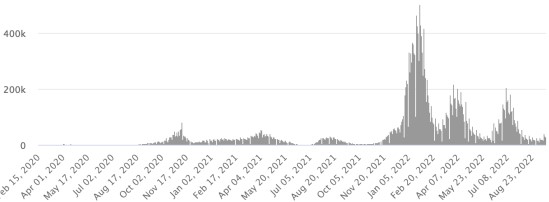 SITUATION MONDIALE 2019-2022 : Dimanche 18 septembre 2022 le nombre de personnes contaminées dans le monde par le coronavirus Covid-19 et ses variants depuis le début de la pandémie (11 mars 2020) s’élève à 617,068,380 cas (+324,118 en 24h), la veille (+529,440 en 24h) Nombre de pays contaminés : 228 *Guérisons : 596,587,832 personnes ont été guéries du Covid-19 dans le monde (+539,959 en 24h), la veille (+678,422 en 24h) *Décès : 6,530,482 personnes sont mortes du Covid-19 dans le monde depuis le début de la pandémie (+910 en 24h), la veille (+3,492 en 24h) *Cas actifs (moins décès et guérisons) dans le monde est actuellement de 13,950,066 cas (-216,751 en 24h), la veille (-152,474 en 24h) Taux de guérison au monde : 96,68% (+) Taux de mortalité au monde : 1,05% (=) Monde : Nombre de cas confirmés quotidiens :
