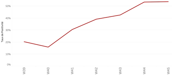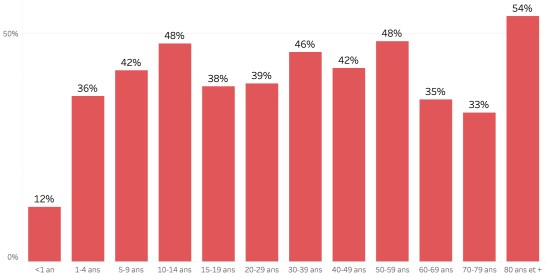 Répartition et écarts des cas suspects depuis le 3 octobre (en 48h) : Moins d’1 an : +194 (+) 1-4 ans : 1,680 cas (+122) 5-9 ans : 1,224 cas (+98) 10-14 ans : 569 cas (+52) 15-19 ans : 415 cas (+20) 20-29 ans : 1,347 cas (+76) 30-39 ans : 1,362 cas (+112) 40-49 ans : 915 cas (+60) 50-59 ans : 615 cas (+41) 60-69 ans : 346 cas (+17) 70-79 ans : 171 cas (+21) 80 et + () cas () Hommes : 59,55% d’hommes (-); femmes 40,45% (+) Taux de positivité par segment d’âge :