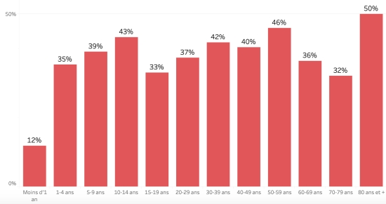 Répartition et écarts des cas suspects, total depuis le 3 octobre (en 24h) : Moins d’1 an : +224 (+5) 1-4 ans : 1,980 cas (+67) 5-9 ans : 1,451 cas (+44) 10-14 ans : 677 cas (+23) 15-19 ans : 500 cas (+18) 20-29 ans : 1,567 cas (+42) 30-39 ans : 1,557 cas (47) 40-49 ans : 1,032 cas (-4 correction Ministère) 50-59 ans : 712 cas (+26) 60-69 ans : 421 cas (+6) 70-79 ans : 205 cas (+8) 80 et + () cas () Hommes : 59,17% d’hommes (-) ; femmes 40,83% (+) Taux de positivité par segment d’âge :