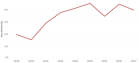 27 novembre 2022 : (dernières données disponibles) Données calculées depuis le premier cas confirmé (3 octobre 2022) Total des cas suspects : 11,953 cas +64 (+5,38%) en 24h (précédent : +52 en 24h ) Total des cas confirmés : 1,031 cas +28 (+2,79%) en 24h, (précédent : +27 en 24h) Total des cas suspects hospitalisés : 10,247 cas +47 (+4,60%) en 24h, (précédent +139 en 24h) Total des décès : 223 décès (127 institutionnels et 76 communautaires) +4 décès (1,79%) en 24h, (précédent : +0 décès en 24h). Bilan partiel du choléra en Haïti selon les données de la Direction d’Épidémiologie, des Laboratoires et de la Recherche du Ministère de la Santé publique. Taux de positivité hebdomadaire :