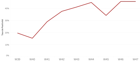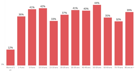Répartition et écarts des cas suspects, total depuis le 3 octobre (en 24h) : Moins d’1 an : +243 (-14) 1-4 ans : 2,234 cas (-73) 5-9 ans : 1,627 cas (-56) 10-14 ans : 797 cas (-23) 15-19 ans : 596 cas (-17) 20-29 ans : 1,786 cas (-62) 30-39 ans : 1,768 cas (-66) 40-49 ans : 1,217 cas (-32) 50-59 ans : 805 cas (-22) 60-69 ans : 480 cas (-13) 70-79 ans : 236 cas (-6) 80 et + (non disponible) cas (non disponible) Hommes : 58,88% d’hommes (-) ; Femmes 41,12% (+) Taux de positivité par segment d’âge :