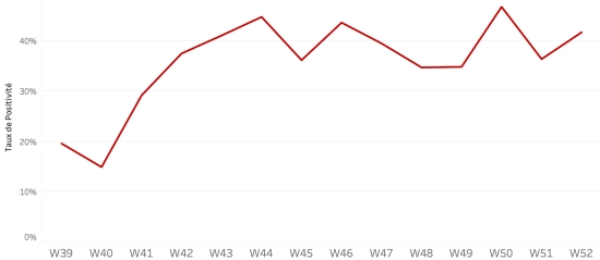 29 décembre 2022 : (dernières données disponibles) Données calculées depuis le premier cas confirmé (3 octobre 2022) Total des cas suspects : 20,540 cas + 220 (+1,08%) en 24h (précédent : + 177 en 24h ) Total des cas confirmés : 1,550 cas +123 (8,61%) en 5 jours, précédent non disponible. Total des cas suspects hospitalisés : 17,641 cas +201 (+1,15%) en 24h, (précédent +167 en 24h) Total des décès : 377 décès (250 institutionnels et 126 communautaires) +0 décès (%) en 24h, (précédent : +1 décès en 24h). Bilan partiel du choléra en Haïti selon les données de la Direction d’Épidémiologie, des Laboratoires et de la Recherche du Ministère de la Santé publique Taux de positivité hebdomadaire :